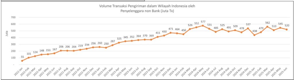 Layanan pengiriman uang oleh penyelenggara non-bank di Indonesia menunjukkan pertumbuhan yang konsisten sepanjang periode 2022 hingga pertengahan 2025. Berdasarkan data yang tersedia, baik volume transaksi maupun nilai nominal.